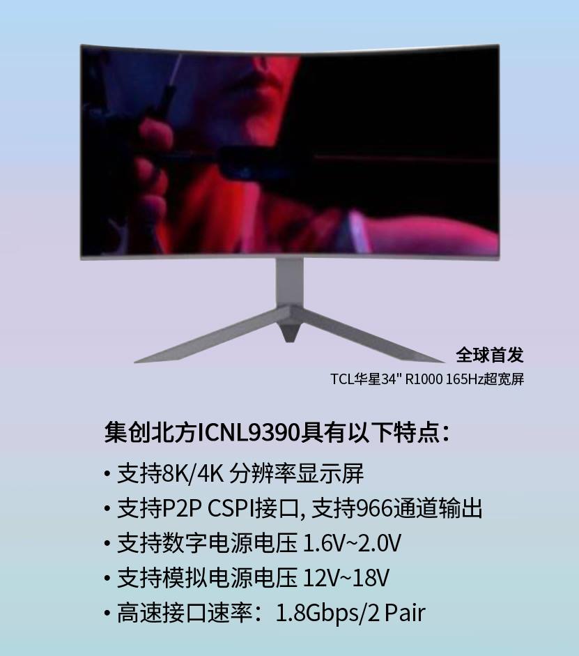 The 8K LCD UHD display driver chip ICNL9390 independently developed by Chipone Technology (Beijing) Co., Ltd. (Chipone) won the Display Component Innovation of the Year Award - Gold Award of SID and Outstanding Product and Solution Award of CUVA, with innovative breakthrough made in such aspects as half-voltage circuit, suppression technology, high-frequency input interface technology, high-performance output operational amplifier scheme, low-power design, etc. Therefore, ICNL9390 is successfully applied to TCL COST’s first 34”R1000 165Hz Ultra-wide Electronic Sports Screen in the world after passing the production verification organized by TCL COST. This electronic sports screen has been a must-have for high-end electronic sports players thanks to the powerful and appealing visual impact and smooth image quality brought by its 21:9 screen ratio, resolution of 3440×1440, 165Hz high refresh rate, and R1000 curvature.