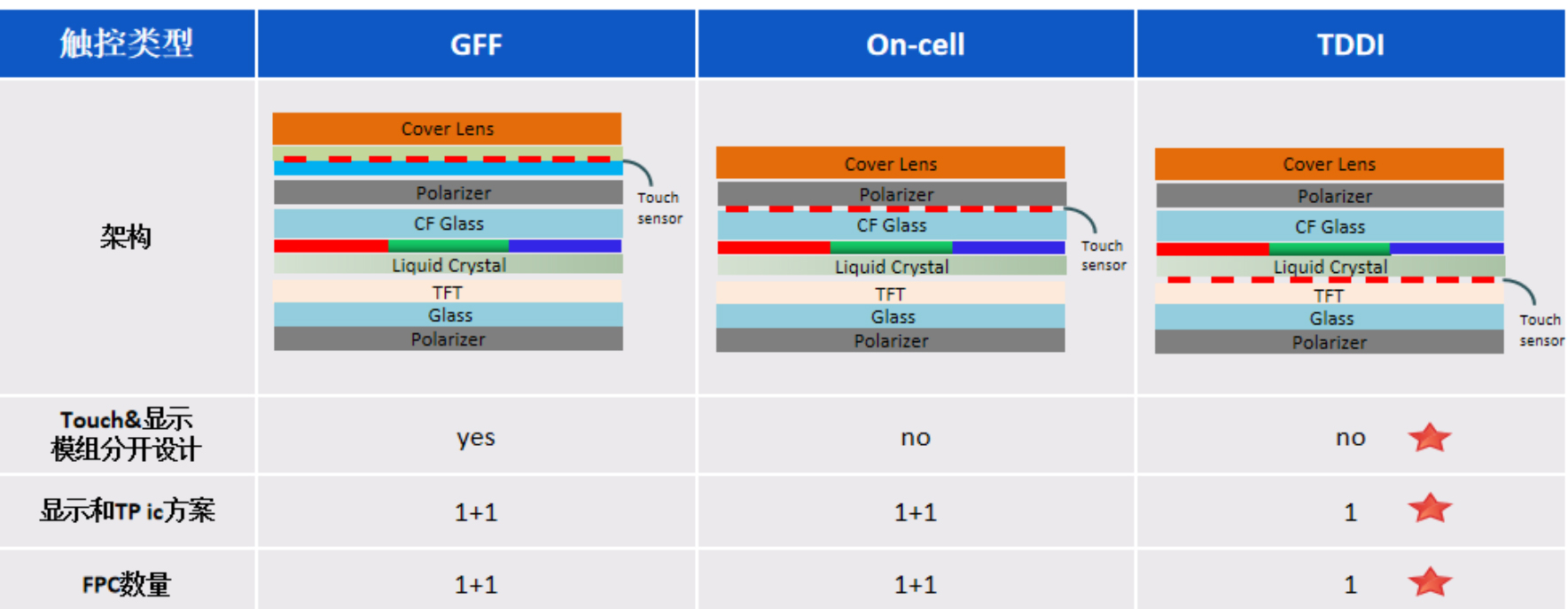 2. On-cell方案是指將Touch sensor嵌入到顯示屏的彩色濾光片基板和偏光片之間,即touch sensor做到顯示上玻璃,顯示和觸控模組二合一了,但ic和FPC還是分開兩套設(shè)計(jì)。3. TDDI方案將Touch sensor完全集成到了顯示TFT面板內(nèi),實(shí)現(xiàn)了顯示觸控模組、IC以及FPC全部二合一,為顯示觸控高度集成一體化方案。