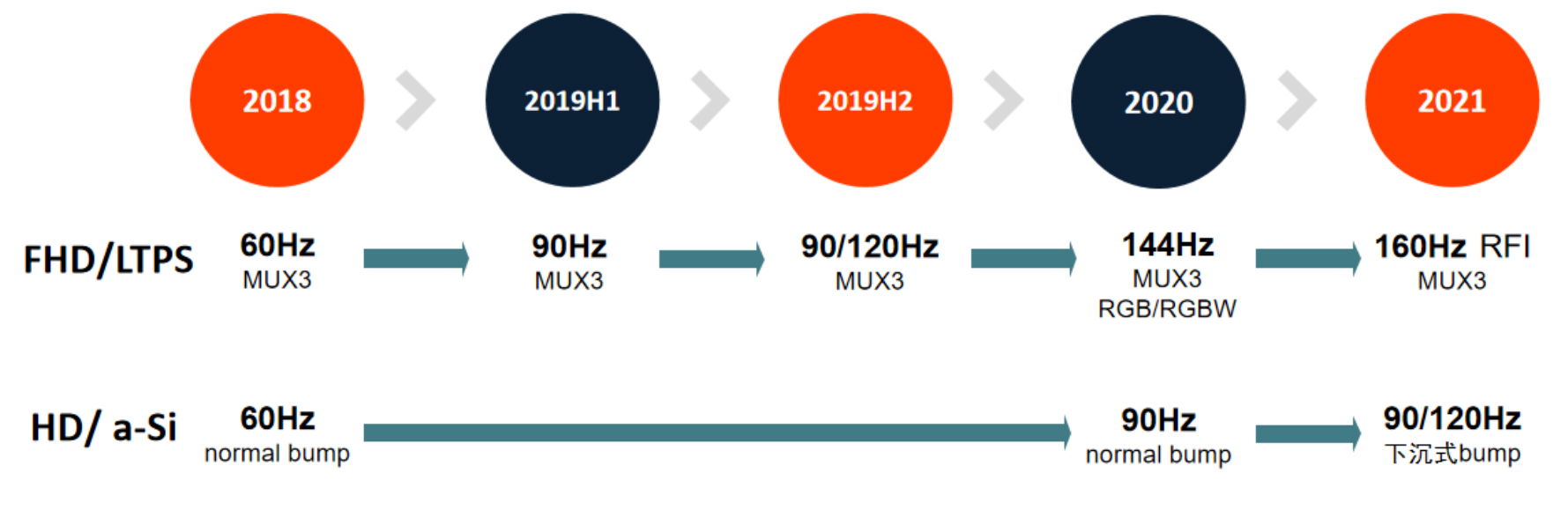 HD a-Si TDDI已實(shí)現(xiàn)90Hz量產(chǎn),新開下沉式bump ic已可支援120Hz,針對(duì)HD 120Hz規(guī)格顯示屏已不是瓶頸且沒有成本的增加,待有成本匹配的主板套片,終端對(duì)應(yīng)規(guī)劃開案,HD也將有可能升級(jí)為120Hz。